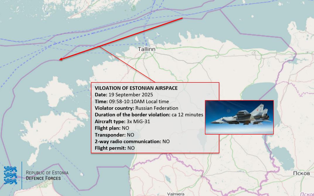 On friday, the morning of September 19, three Russian fighter jets MIG-31 entered Estonian airspace in the Vaindloo Island area without permission, and remained there for approximately 12 minutes.